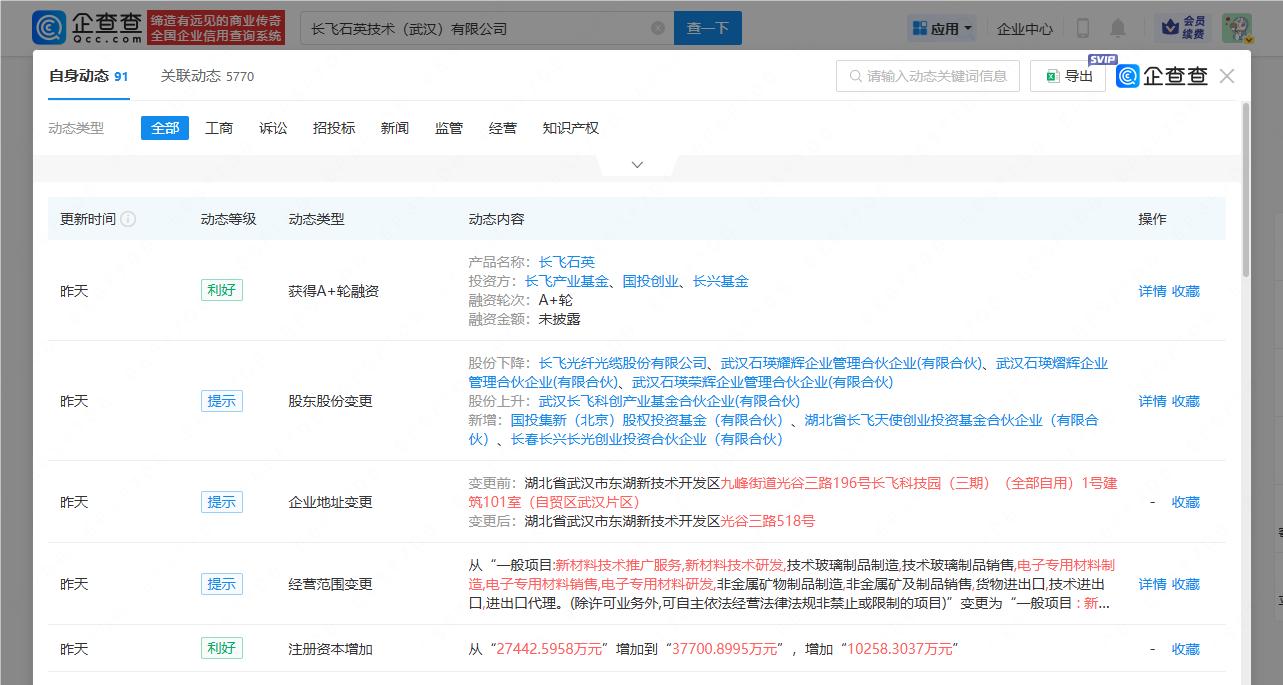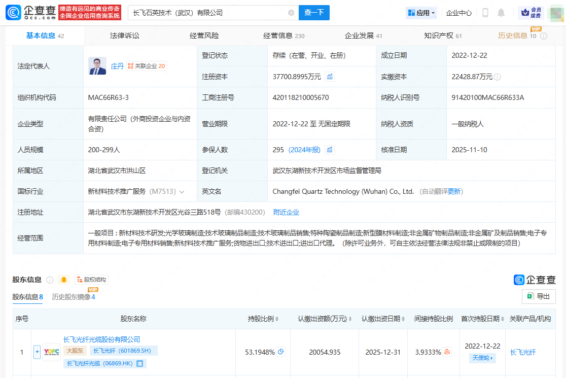 近日,长飞光纤(601869)旗下长飞石英技术(武汉)有限公司发生工商变更,注册资本由约2.74亿人民币增至约3.77亿人民币,新增国家大基金三期旗下国投集新(北京)股权投资基金(有限合伙)、湖北省长飞天使创业投资基金合伙企业(有限合伙)、长春长兴长光创业投资合伙企业(有限合伙)为股东。企查查信息显示,长飞石英技术(武汉)有限公司成立于2022年12月,法定代表人为庄丹,经营范围涉及新材料技术研发、光学玻璃制造、技术玻璃制品制造、技术玻璃制品销售等。